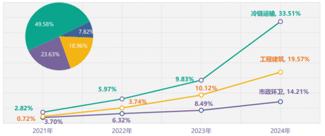 從新能源專用汽車的應(yīng)用場(chǎng)景分布看,市政環(huán)衛(wèi)、冷鏈運(yùn)輸、工程建筑構(gòu)成三大主力板塊,合計(jì)占據(jù)92.5%市場(chǎng)份額。其中冷鏈運(yùn)輸領(lǐng)域新能源滲透率達(dá)33.51%,居各細(xì)分領(lǐng)域之首,這主要得益于生鮮電商爆發(fā)式增長與疫苗等醫(yī)療冷鏈運(yùn)輸?shù)膭傂孕枨蟆?/span>