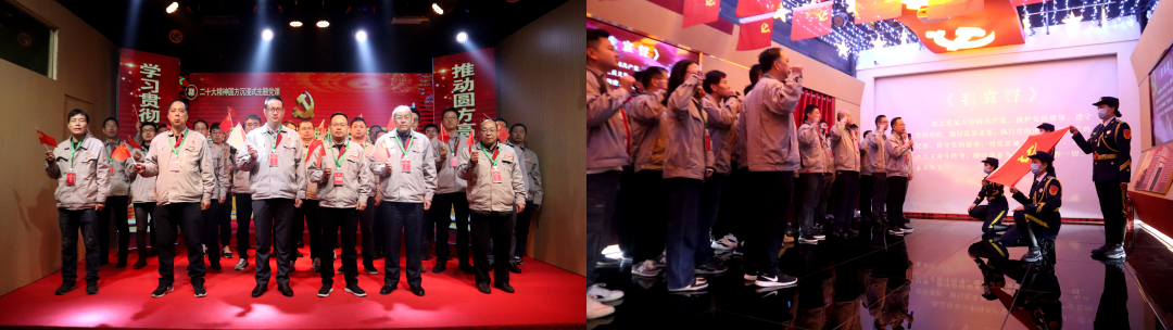 在工作人員的講解下,大家認(rèn)真聆聽圓方集團(tuán)“六課教育”、“四五”創(chuàng)新工作模式、“五新”非公黨建工作方法,以及其他非公黨建新體系、新機(jī)制,深刻領(lǐng)悟到“黨組織就是靠山”、“黨建也是生產(chǎn)力”。在二十大精神沉浸式主題展館,大家走進(jìn)長廊廳,通過欣賞舞蹈、唱紅歌、誦讀二十大精神、現(xiàn)場答題、重溫入黨誓詞等互動環(huán)節(jié),感受到一堂“網(wǎng)紅薛書記”帶來的生動黨課。